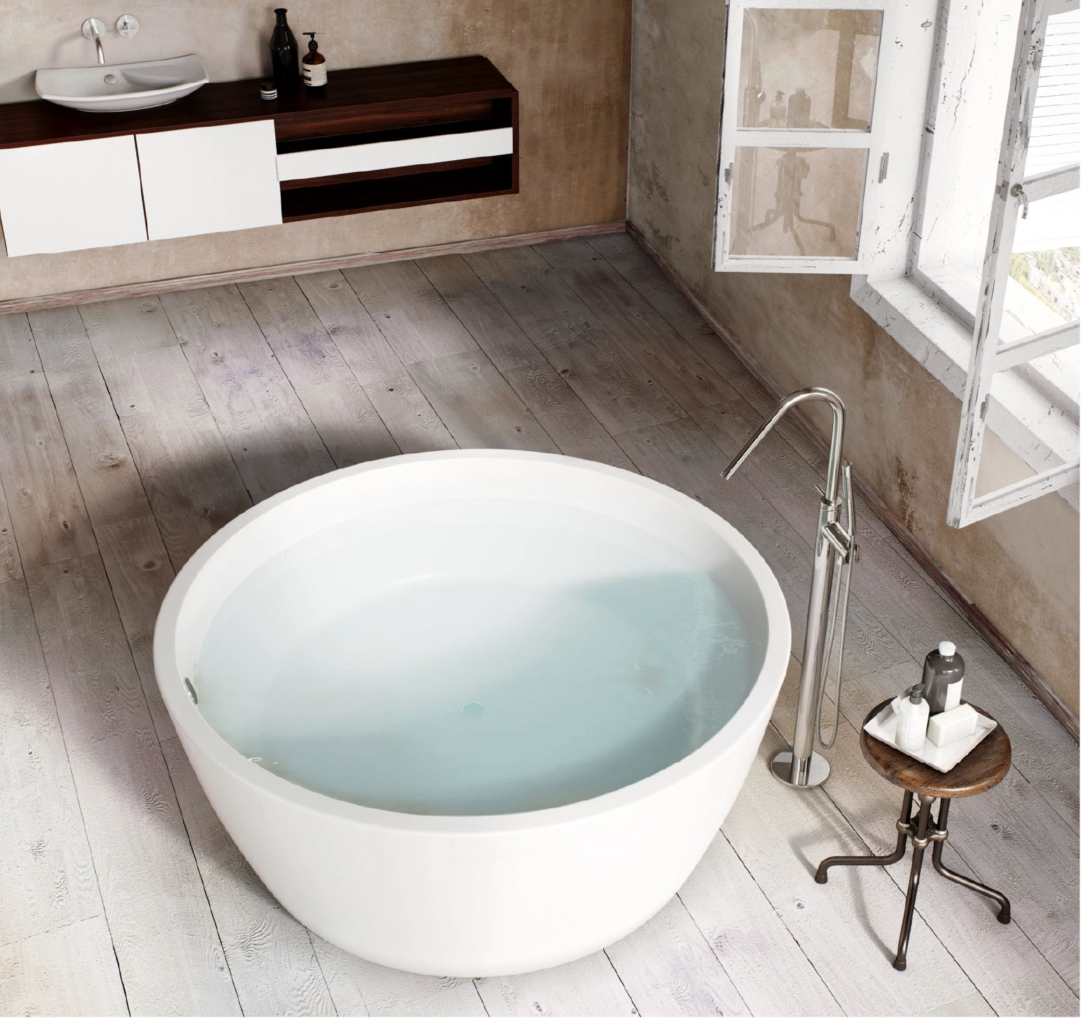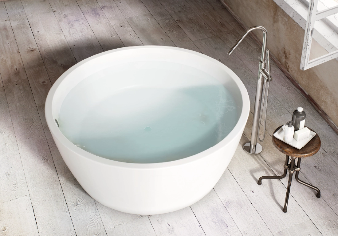 The core material is consisted of marble, resin and polymer with the use of high technology invention from Germany in the manufacturing process. These materials are produced under vacuum thereby eliminating all trapped air making them non porous and thus absorbing much less water than their natural counterpart. The result is a unique and versatile materialperfect for making luxurious bathtubs.