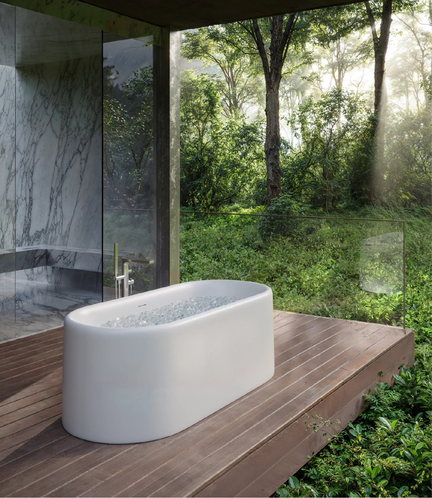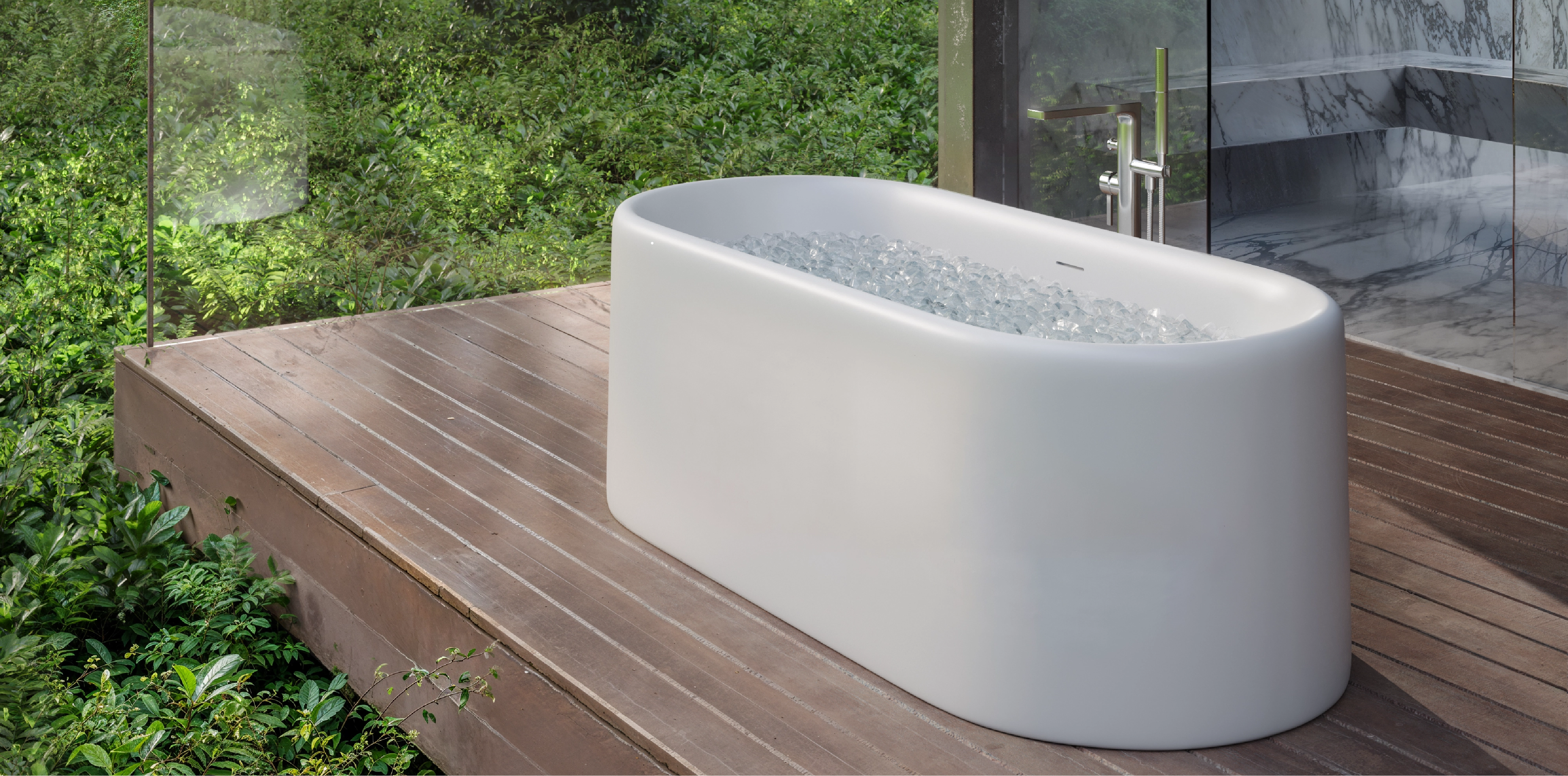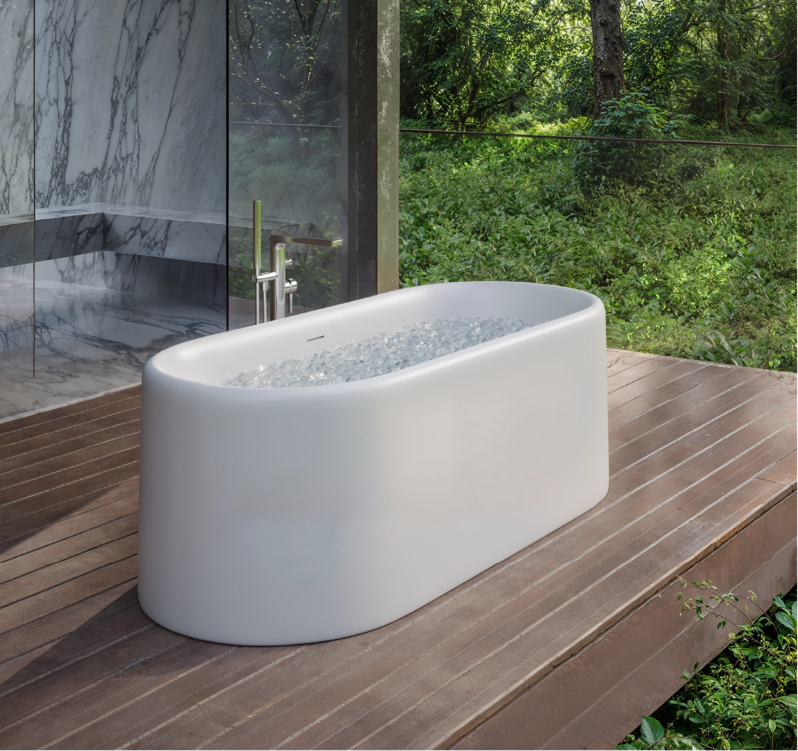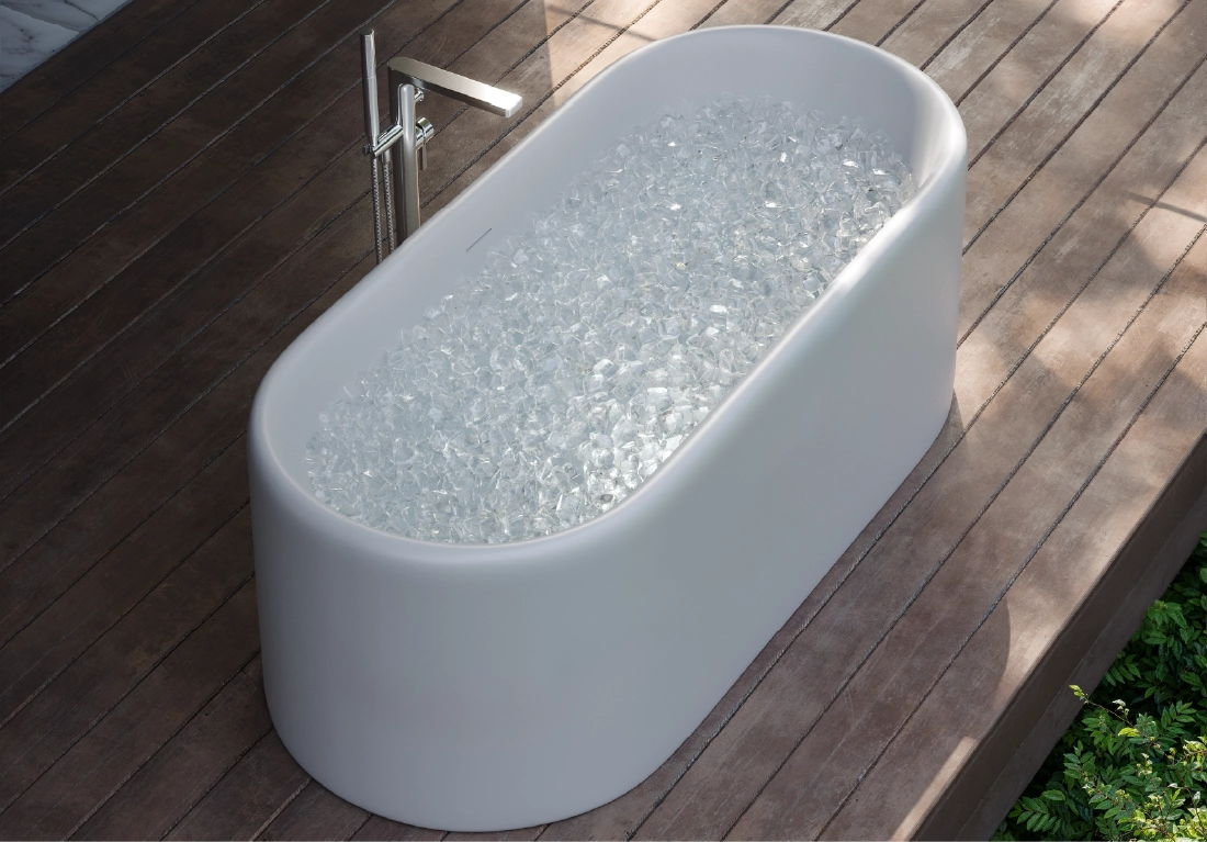 The core material is consisted of marble, resin and polymer with the use of high technology invention from Germany in the manufacturing process. These materials are produced under vacuum thereby eliminating all trapped air making them non porous and thus absorbing much less water than their natural counterpart. The result is a unique and versatile materialperfect for making luxurious bathtubs.