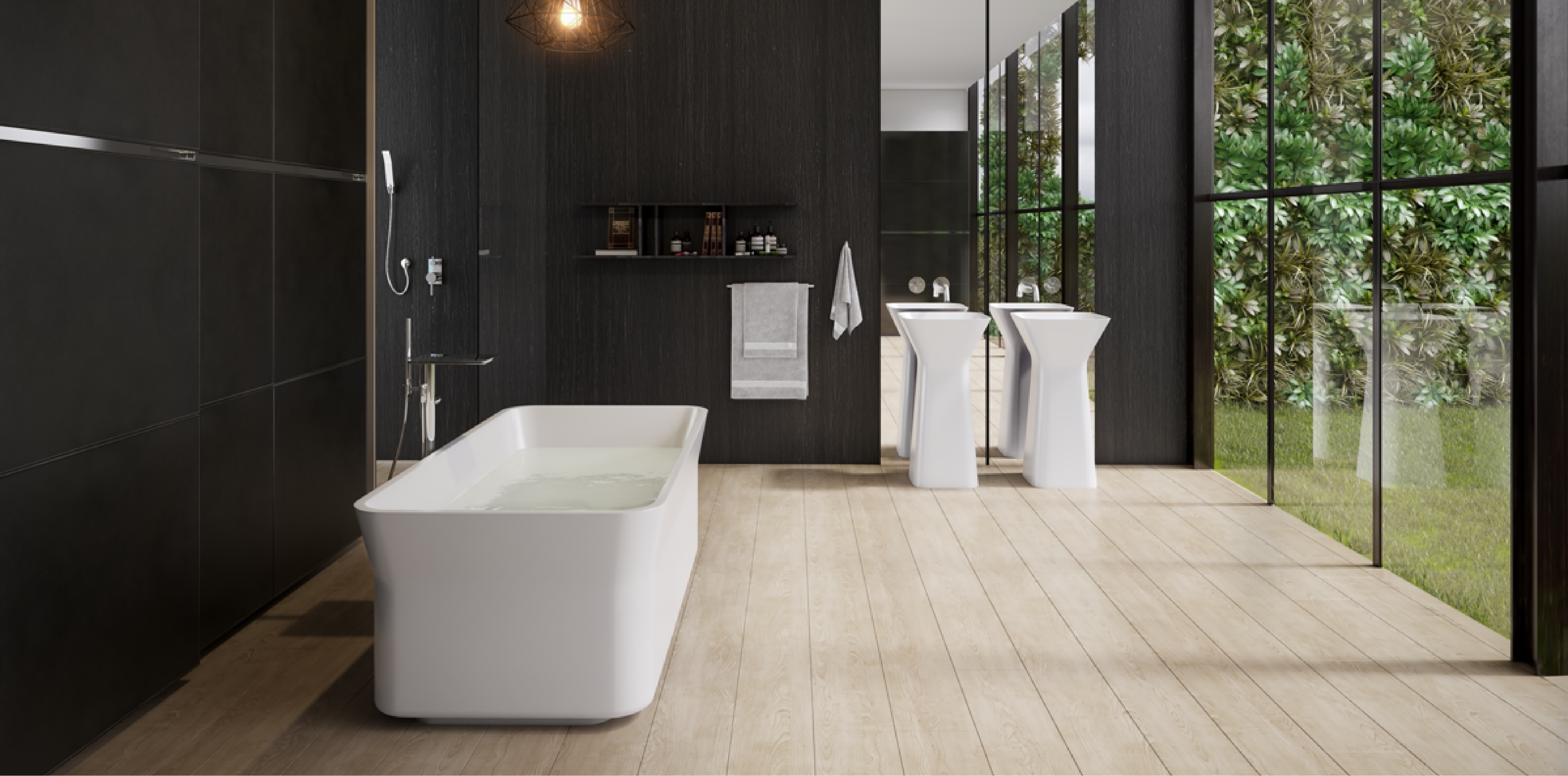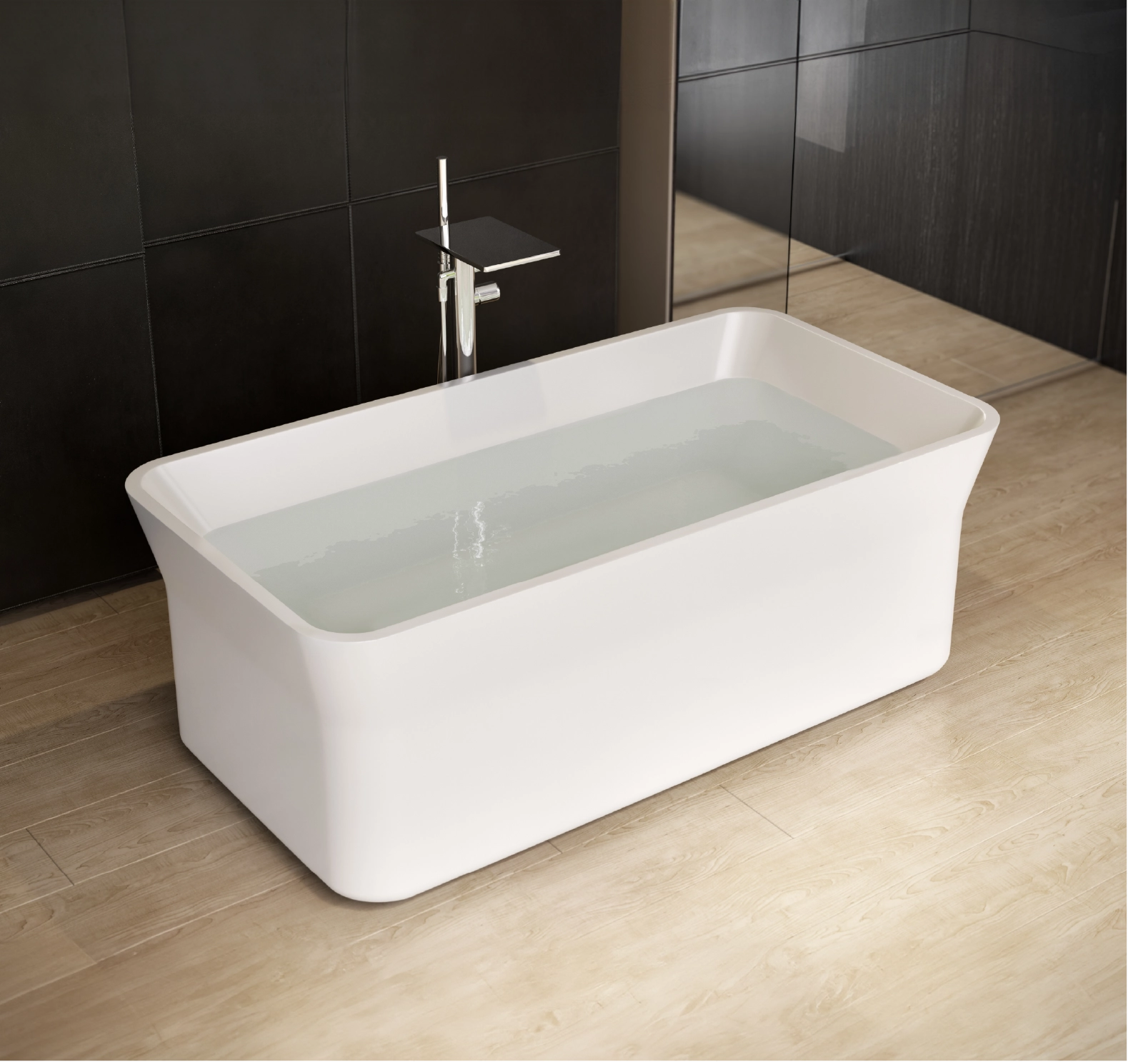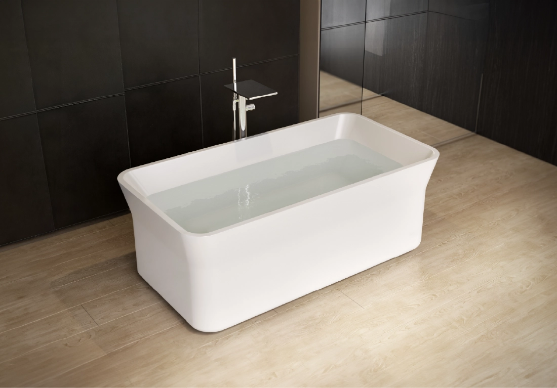 The core material is consisted of marble, resin and polymer with the use of high technology invention from Germany in the manufacturing process. These materials are produced under vacuum thereby eliminating all trapped air making them non porous and thus absorbing much less water than their natural counterpart. The result is a unique and versatile materialperfect for making luxurious bathtubs.