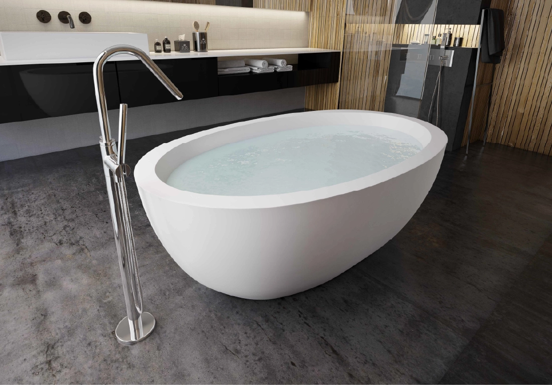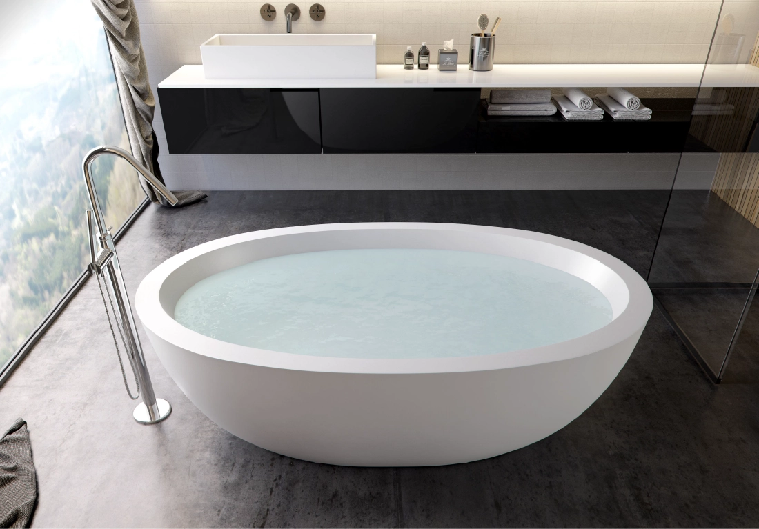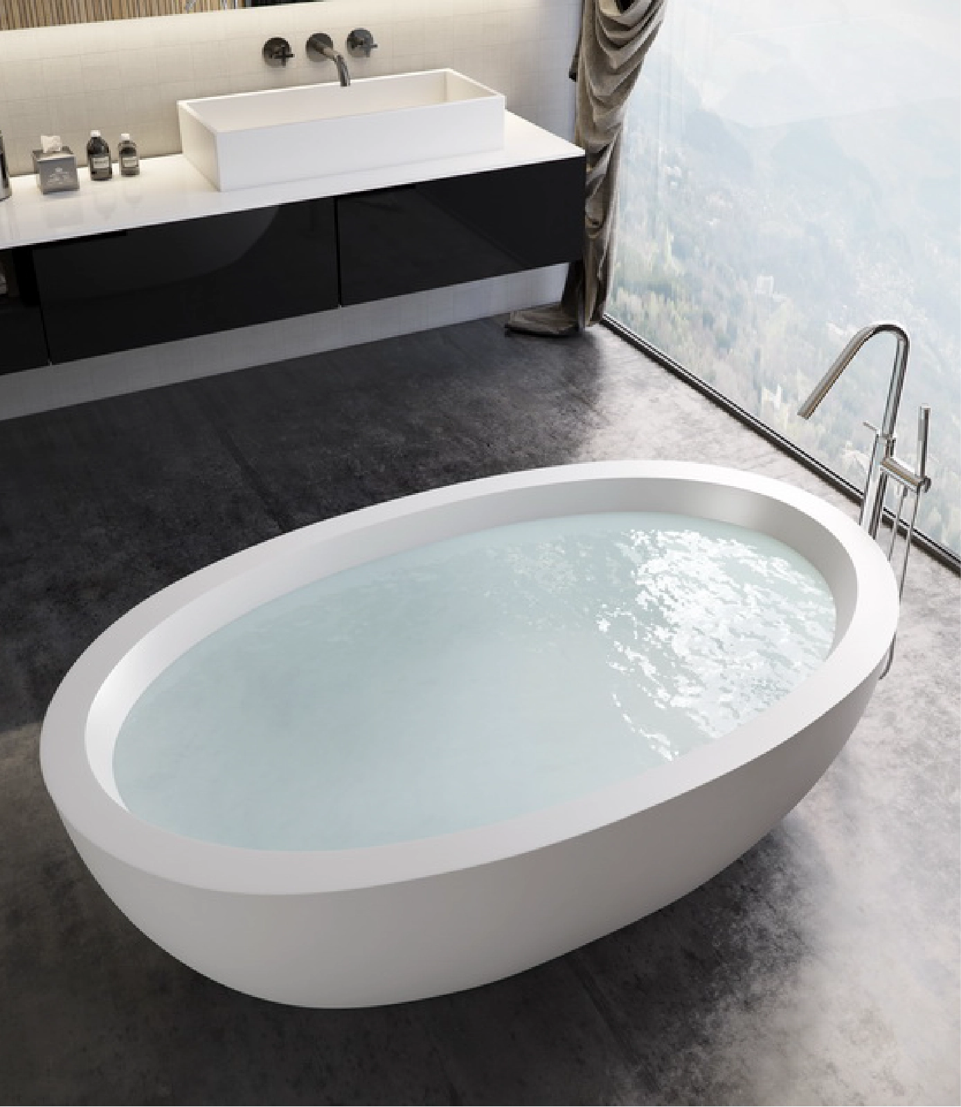 The core material is consisted of marble, resin and polymer with the use of high technology invention from Germany in the manufacturing process. These materials are produced under vacuum thereby eliminating all trapped air making them non porous and thus absorbing much less water than their natural counterpart. The result is a unique and versatile materialperfect for making luxurious bathtubs.