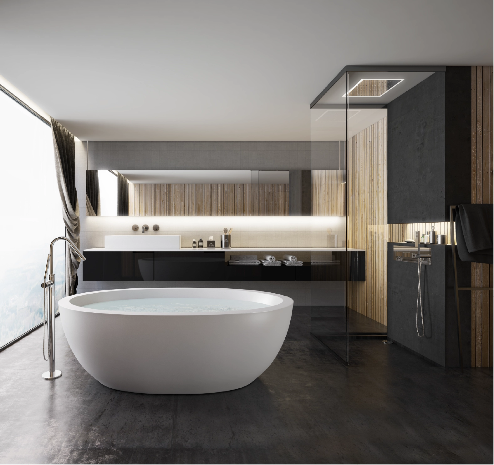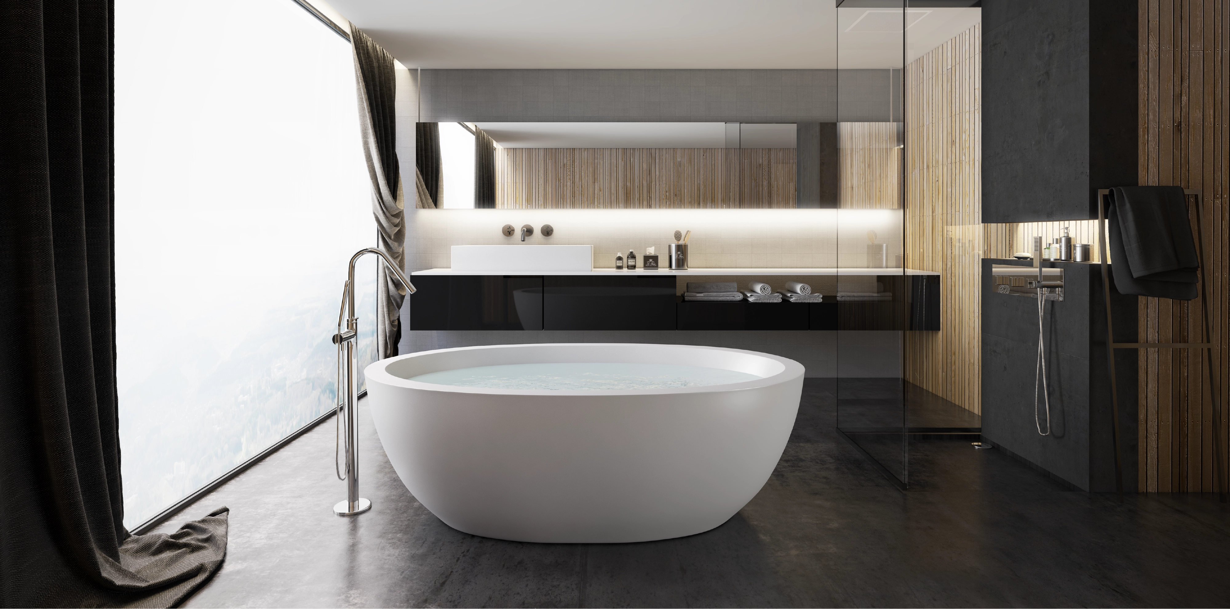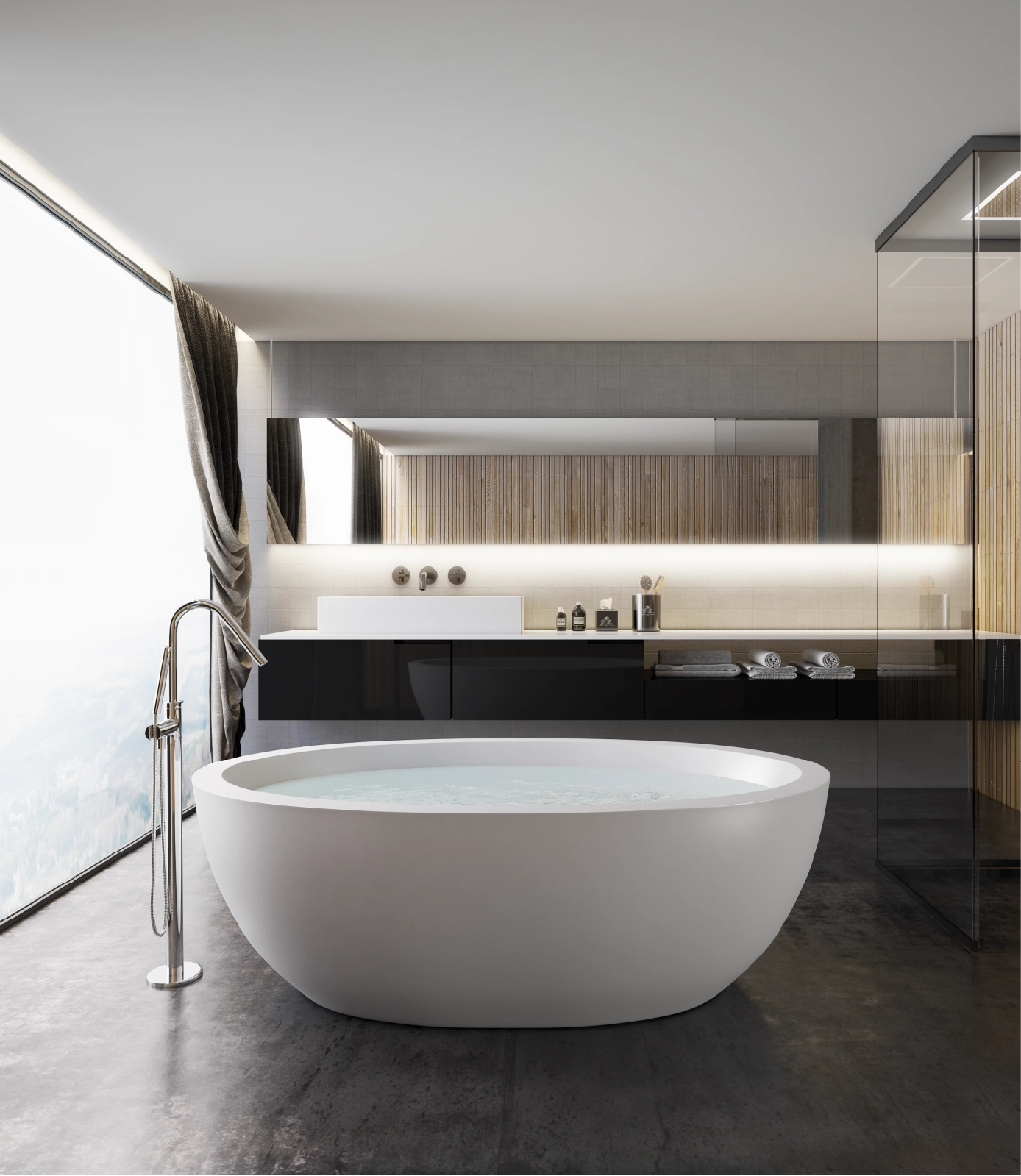 The core material is consisted of marble, resin and polymer with the use of high technology invention from Germany in the manufacturing process. These materials are produced under vacuum thereby eliminating all trapped air making them non porous and thus absorbing much less water than their natural counterpart. The result is a unique and versatile materialperfect for making luxurious bathtubs.
