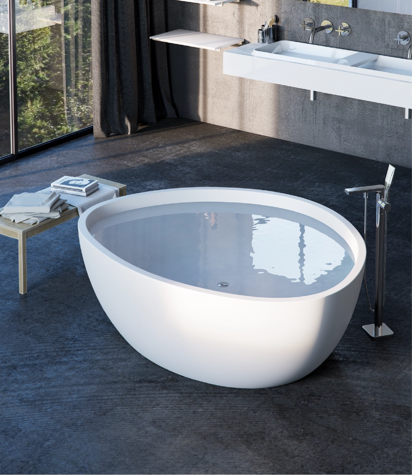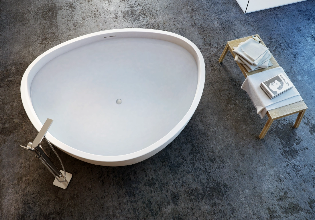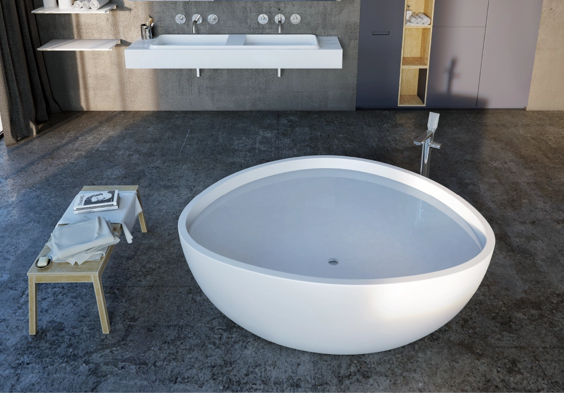 The core material is consisted of marble, resin and polymer with the use of high technology invention from Germany in the manufacturing process. These materials are produced under vacuum thereby eliminating all trapped air making them non porous and thus absorbing much less water than their natural counterpart. The result is a unique and versatile materialperfect for making luxurious bathtubs.