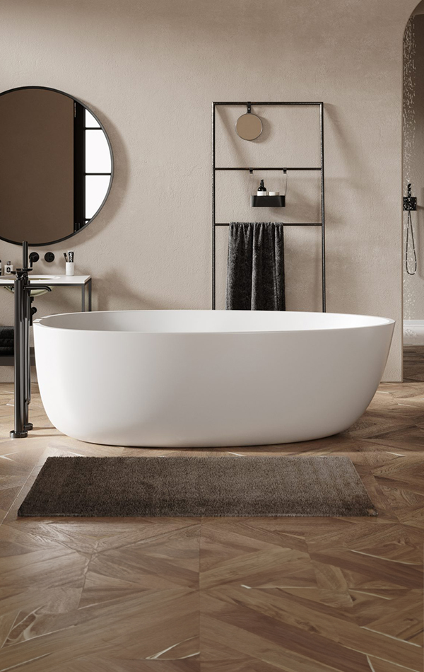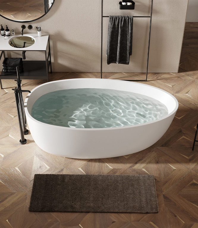 The core material is consisted of marble, resin and polymer with the use of high technology invention from Germany in the manufacturing process. These materials are produced under vacuum thereby eliminating all trapped air making them non porous and thus absorbing much less water than their natural counterpart. The result is a unique and versatile materialperfect for making luxurious bathtubs.
