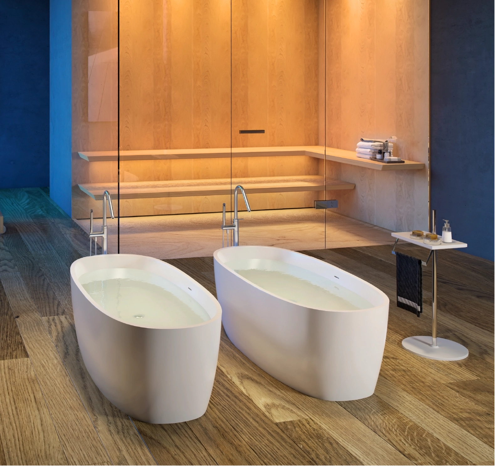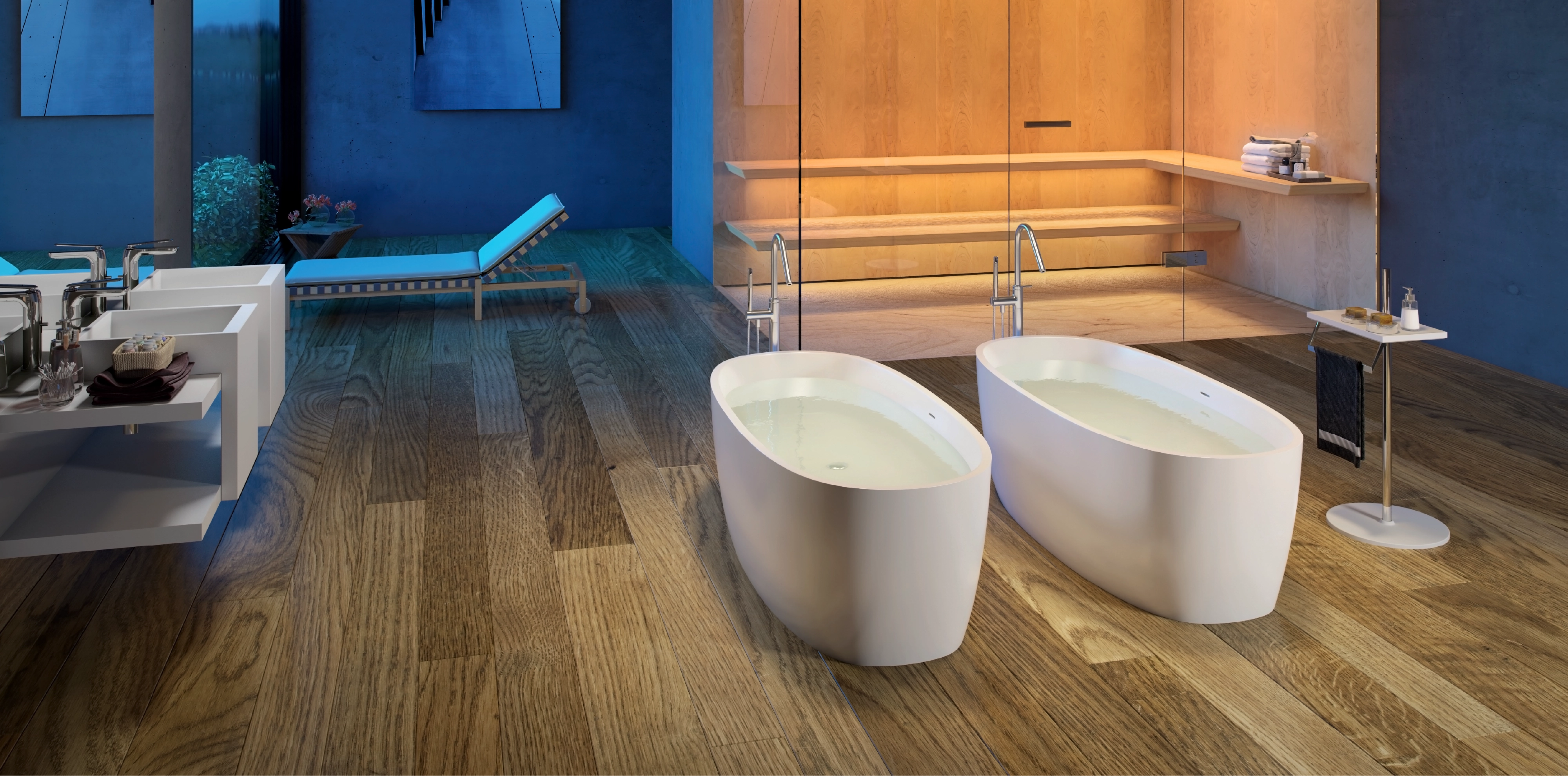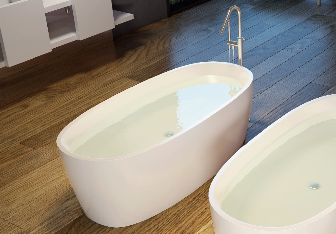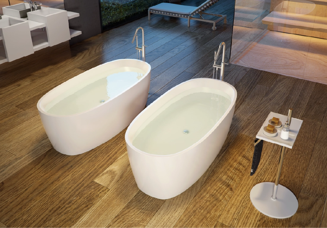 The core material is consisted of marble, resin and polymer with the use of high technology invention from Germany in the manufacturing process. These materials are produced under vacuum thereby eliminating all trapped air making them non porous and thus absorbing much less water than their natural counterpart. The result is a unique and versatile materialperfect for making luxurious bathtubs.